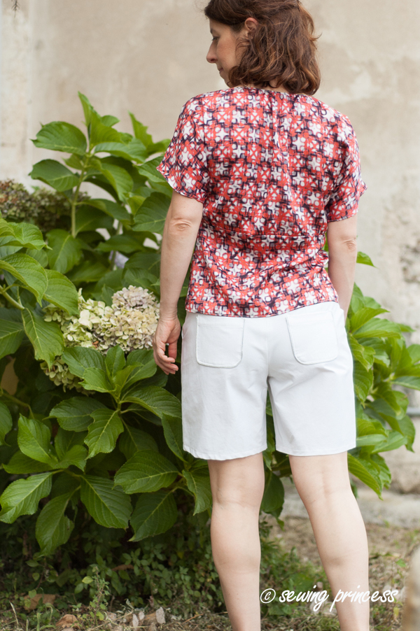 Il cartamodello è semplice da realizzare e non ho fatto modifiche. Anche se guardando le foto e paragonandole con quelle dell’originale credo che avrei potuto stringere leggermente le gambe. Ma è troppo tardi…però i pantaloncini sono comodissimi e li ho già messi molto! Sono anche contenta di aver usato del cordoncino argentato rimasto per le tasche ;o) E il top è una vecchia creazione