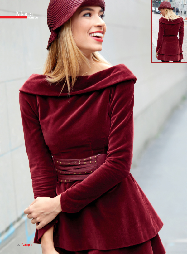 Both the pleated skirt (without peplum) and short jacket patterns are included in this issue. It could look nice in a different print with boots and dark tights as in the picture.