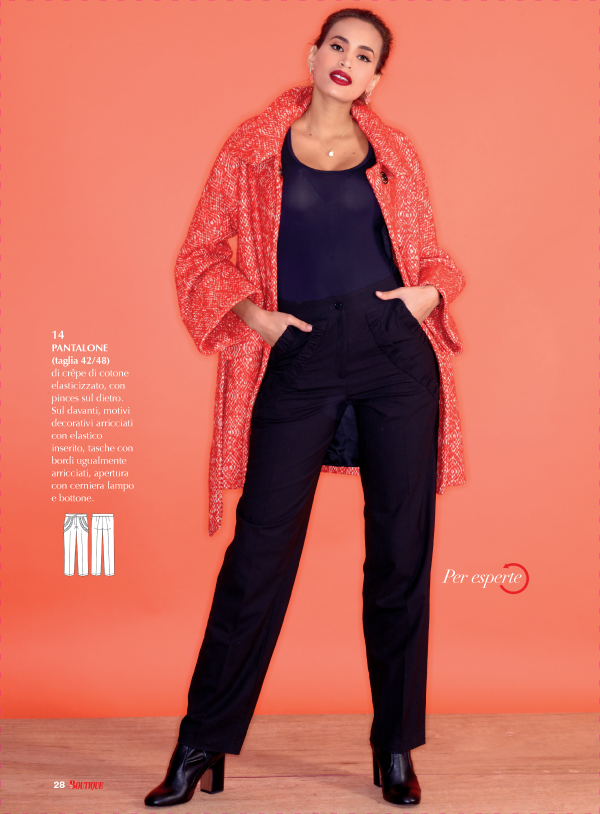 Mi piace il cappotto. Invece non capisco la necessità di quegli elastici che si vedono sul disegno tecnico…il davanti è realizzato assemblando 3 diverse sezioni e credo per questo il modello viene classificato ´per esperte´.