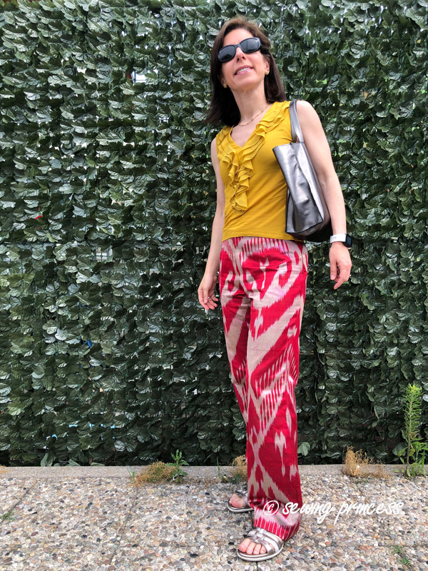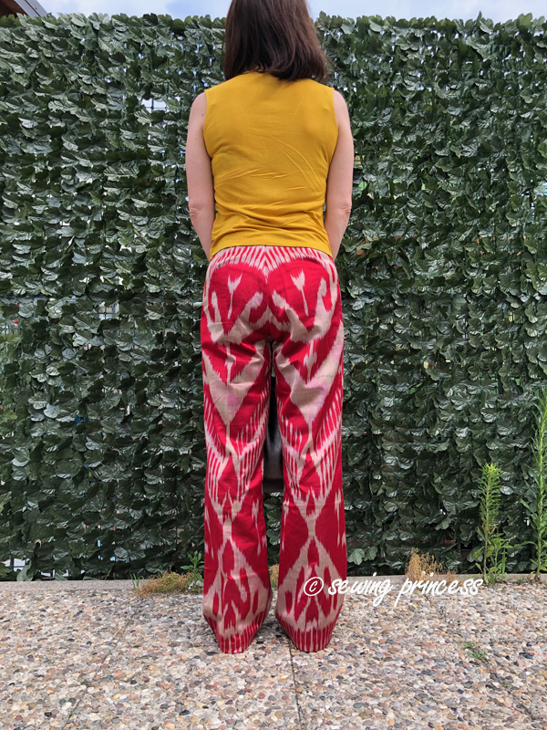 Ever since I got it I knew I wanted to make pants and I needed I simple pattern to avoid breaking the motif. When I finally got inspired to make them last year…and chose my trusty La mia boutique pants pattern I realized the panels were too narrow to fit the back pattern piece! So, I got demotivated and parked the project for a whole year